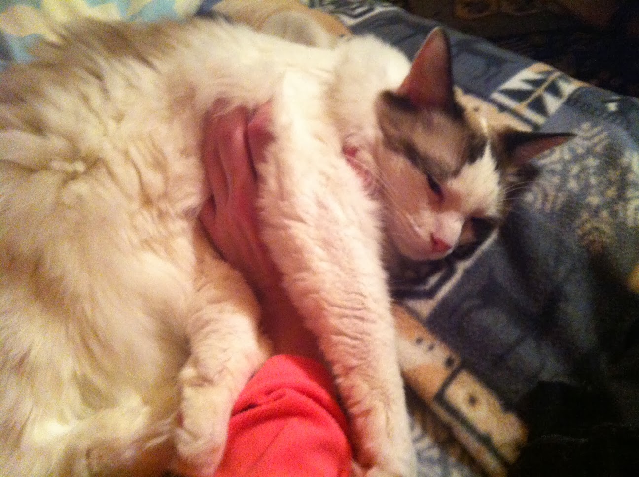 Tästä Nuppu innostuu entisestään ja kellahtaa jalan päälle rapsuteltavaksi. Joskus